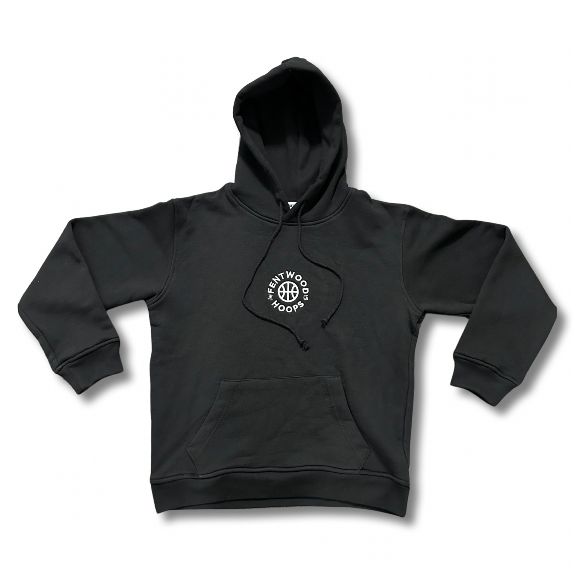 our logo hoodie is a classic black terry fabric cut & sewn in Los Angeles. Fentwood Hoops logo 3.5 inch embroidery on chest.